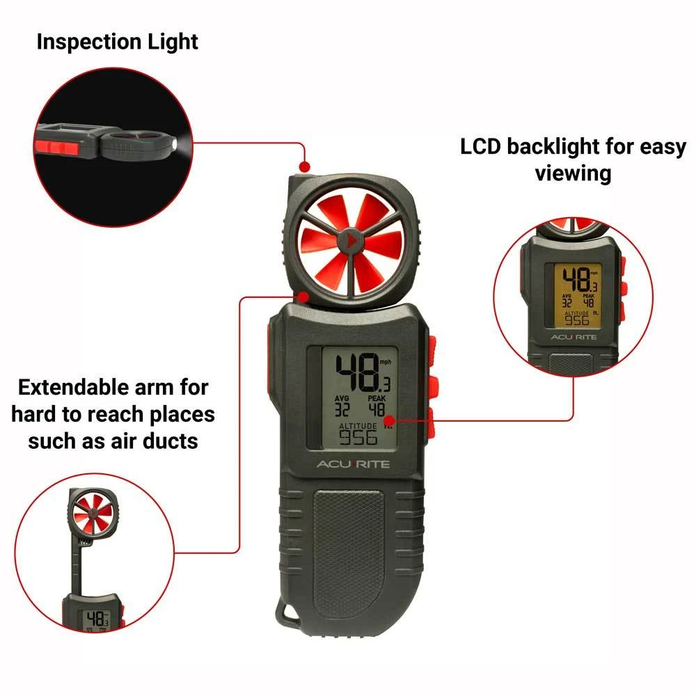 The AcuRite portable anemometer with inspection light provides vital wind speed, altitude, temperature and humidity readings in a durable design. It also offers helpful features like high and low records, wind Chill and heat index calculation, an LCD backlight for easy viewing, and a convenient inspection light. Portable weather station features include 30-second updates of temperature (-40 degrees F. to 158 degrees F.). (-40 degrees C. to 70 degrees C.) and humidity (1% to 99% ) with high and low records. Perfect for HVAC applications, hiking, Golf, hunting and fishing, outdoor sports, and more. It’s more than accurate, it’s AcuRite.