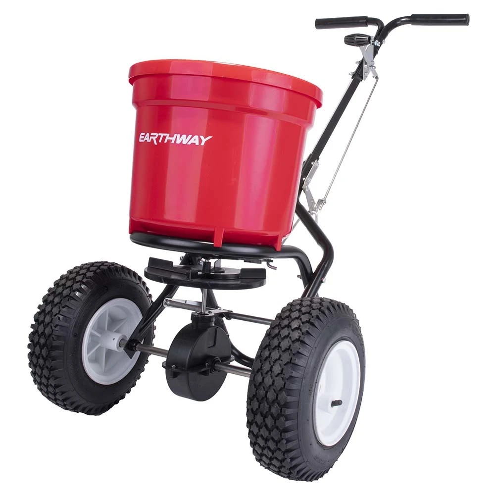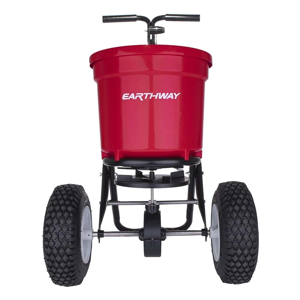 - HEAVY-DUTY, DURABLE CONSTRUCTION MAKES YOUR SPREADER LAST AND LAST. From steel “”T”” bar handle to the frame specifically designed for even weight distribution with widespread 13″” pneumatic stud tires. Even better, the sturdy tires won’t go flat, making it easy to spread fertilizer, salt, or seed on slopes or other uneven ground. Because of the engineering of the tires, EarthWay’s 2150 spreader is built to go and go.