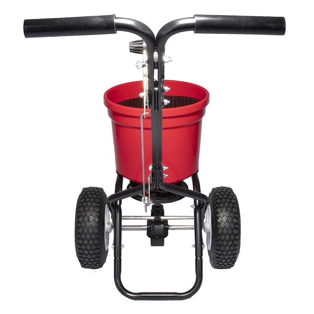 The unit is fitted with the patented three-hole drop design that ensures an even spreading at 180 degrees. The 2-position height adjustable handle and “T”-Speed lever provide total operator control and comfort for users of different heights. The even spread 3-hole drop shut-off system ensures an even spread pattern and provides a feathered spreading edge for accurate applications. The unit includes a three-position height-adjustable handle to be fitted to all users. The larger 13 in. pneumatic wheels glide through the heaviest turf. In addition, the non-corrosive shut-off plate ensures seasons of trouble-free spreading, and we provide a two-year warranty on the gearbox.