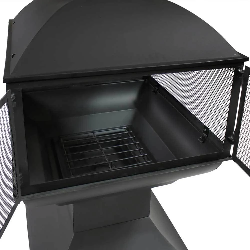 - Perfect on the Patio: chimenea is 22 inches square x 57 inches tall. Weighs 39.4 pounds. Sturdy 20.5-inch square base at bottom x 11.5 inches height from base to bottom of fire bowl, 10.25-inch square log grate. Ash pan is 8 inches square (inner) x 9 inches square (outer) x 1.5 inches tall, 7-inch square flue grill, 9-inch square rain cap. Flue is 21 inches tall x 7.75 inches square at base x 6 inches square at top, 21-inch square x 6.5 inches tall fire area, 8.5-inch tall screen