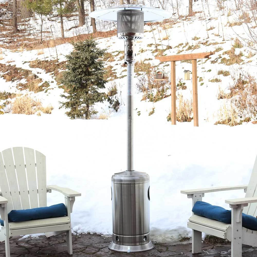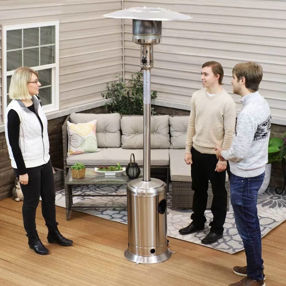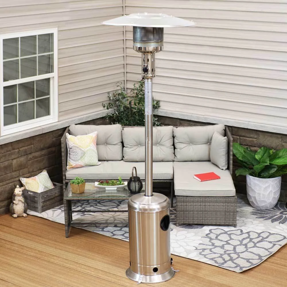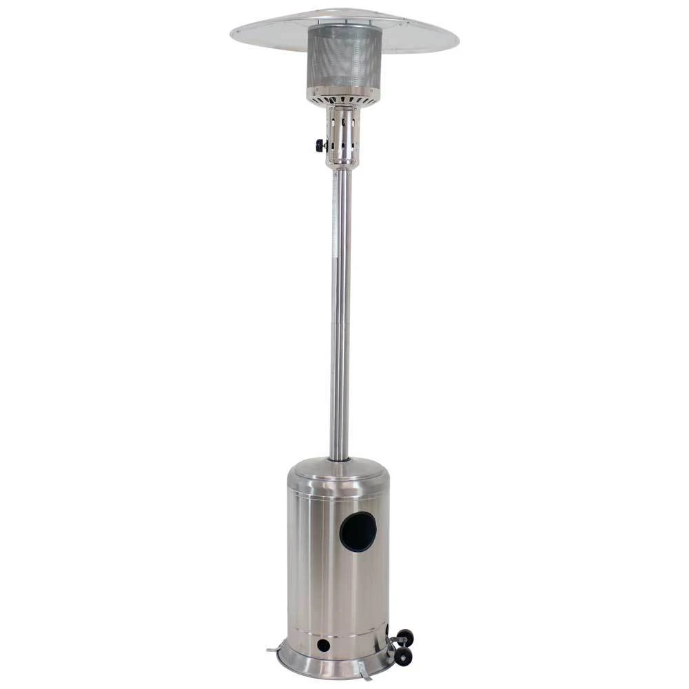 Enjoy the patio even when the temperatures drop with this cozy Sunnydaze Outdoor Patio Heater. This heater produces 47,000 BTUs of heat and features two wheels attached to the base so you can easily move the heater around the patio. This outdoor patio heater with wheels is made from durable steel with a powder-coated finish for a dependable and stylish look. A black, weather-resistant PVC cover is included to protect the propane heater from the elements when not in use.