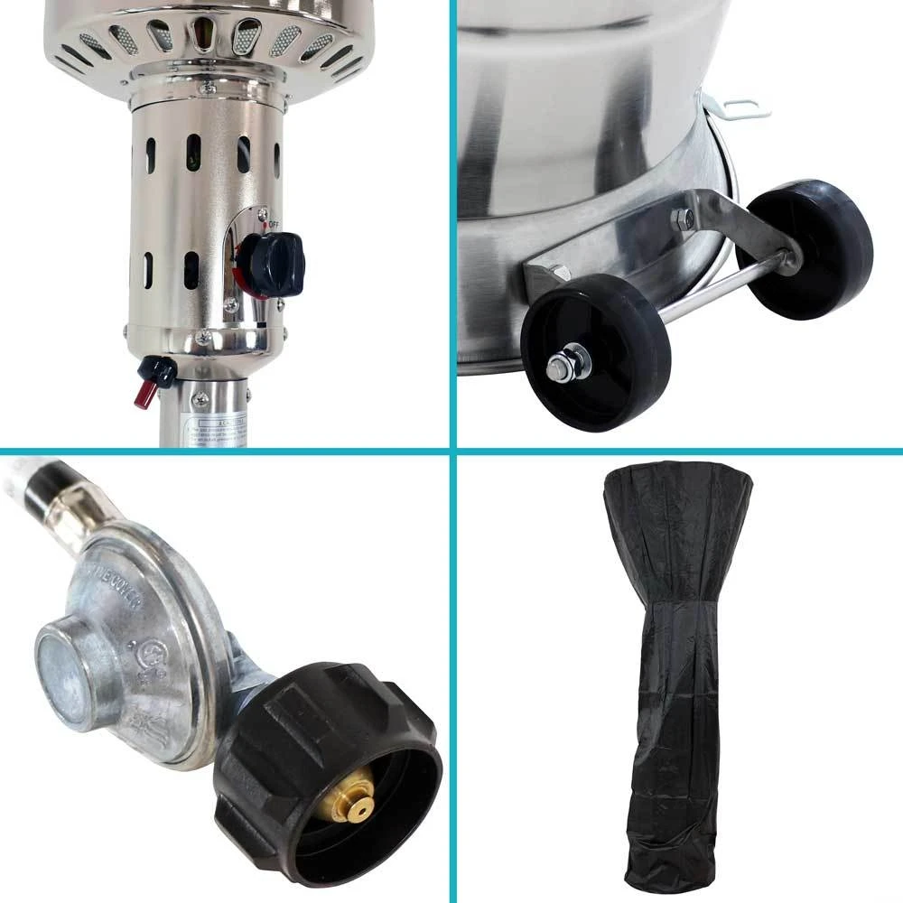 - Patio Heater with Wheels and Cover: this propane patio heater with cover features two wheels for easy mobility and a convenient table for drinks, snacks, and more. The protective cover also features a zipper for easy access. A 20 lb propane gas cylinder is required for operation (not included).